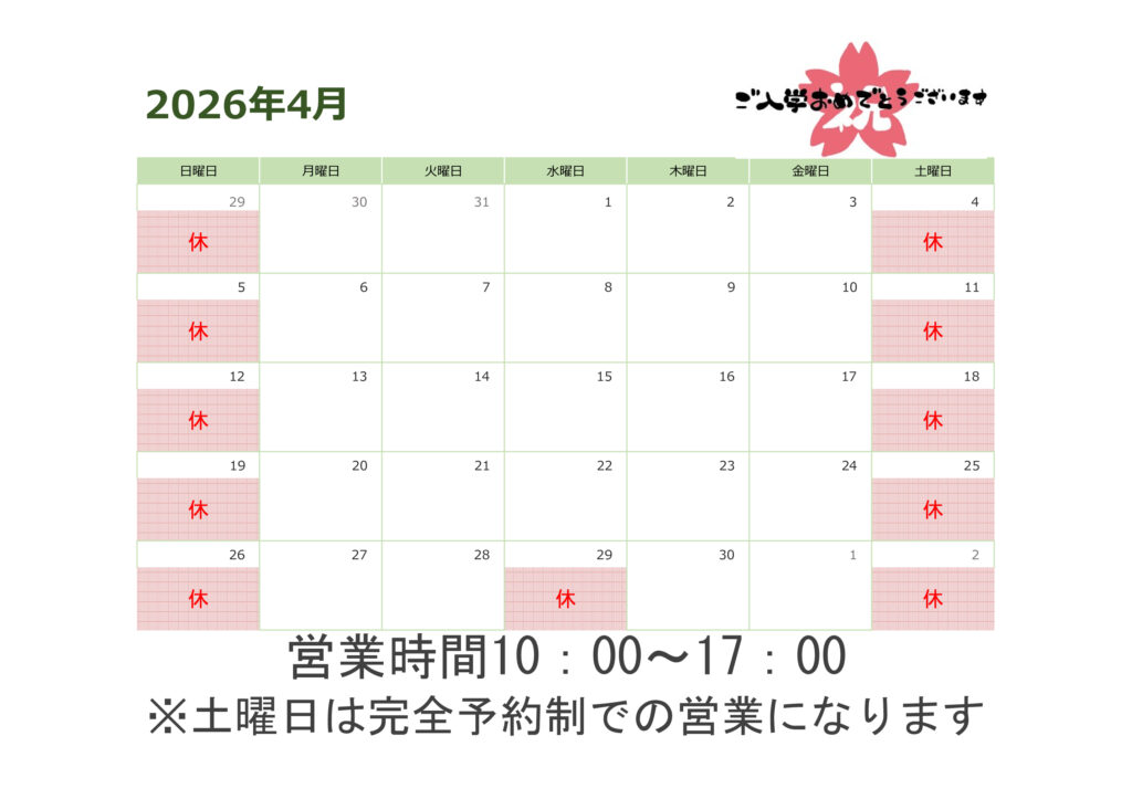 4月の営業日のご案内