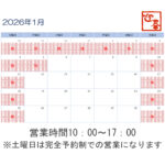 - 1月の営業日のご案内朝10時から夕方17時まで営業しております。土曜日は完全予約制での営業となりますので、お気軽にお問い合わせくだ… 続きを読む: 1月の営業日のご案内