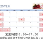 - 2月の営業日のご案内朝10時から夕方17時まで営業しております。土曜日は完全予約制での営業となりますので、お気軽にお問い合わせくだ… 続きを読む: 2月の営業日のご案内