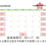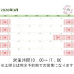 - 3月の営業日のご案内朝10時から夕方17時まで営業しております。土曜日は完全予約制での営業となりますので、お気軽にお問い合わせくだ… 続きを読む: 3月の営業日のご案内